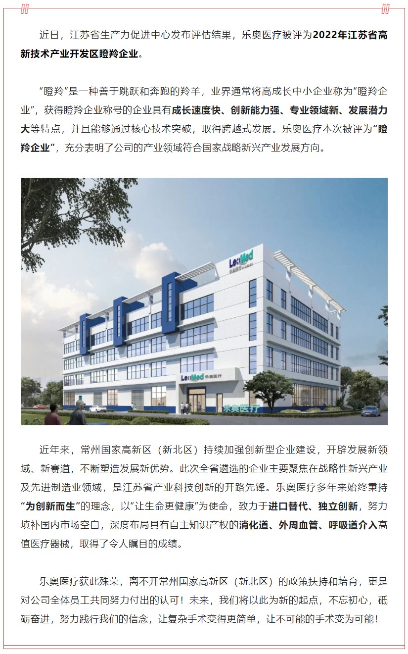 樂奧醫(yī)療被評(píng)為江蘇省高新技術(shù)產(chǎn)業(yè)開發(fā)區(qū)瞪羚企業(yè)!