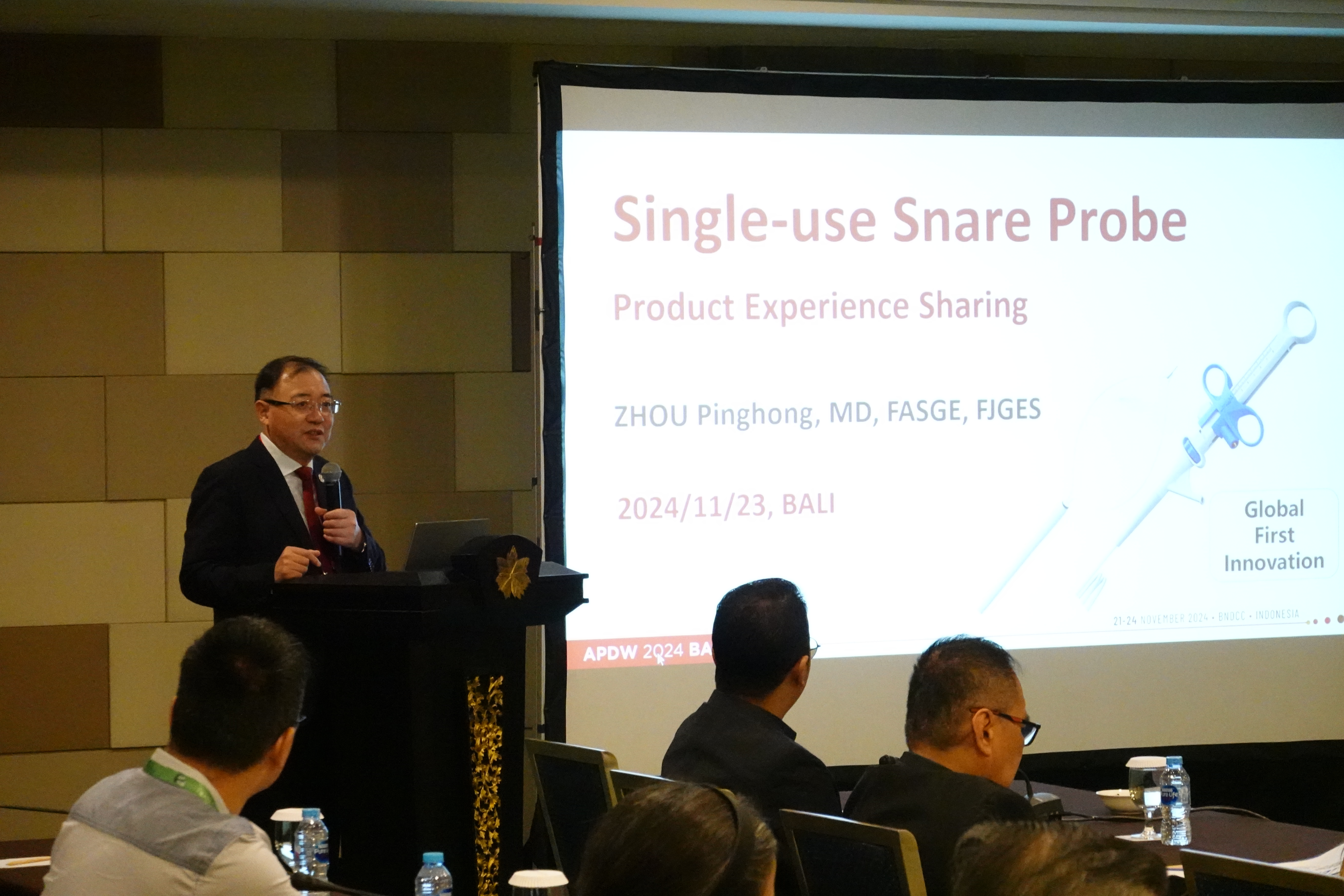 Professor Zhou Pinghong, from theZhongshan Hospital affiliated with Fudan University, gave a detailedpresentation on the experience of using the Disposable Electrosurgical LoopKnife (ALL IN ONE). This innovative product, designed specifically for the treatmentof early-stage gastrointestinal cancer, combines five key functions: marking,dissection, supplemental injection, loop ligation, and argon plasmacoagulation. The product significantly optimizes the surgical process byreducing the frequency of instrument changes during the procedure, greatlyshortening surgery time, and effectively reducing the patient’seconomic burden. In addition to explaining the structure and functions of ALLIN ONE, as well as providing detailed usage data, Professor Zhou also citedseveral surgical case examples.